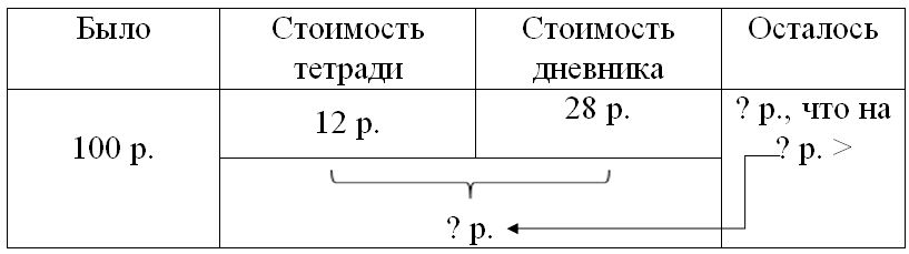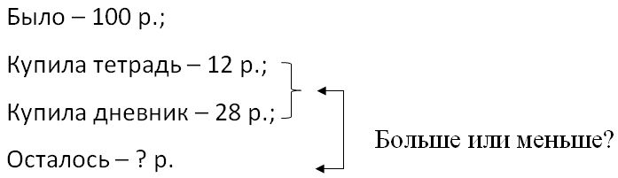 Краткое условие: У Даши было 100 р. Она купила тетрадь за 12 р. и дневник за 28 р. Больше или меньше денег она истратила, чем осталось? Дай ответ и проверь его, решив задачу.
