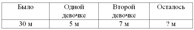 Краткое условие: В мотке было 30 м ленты. Одной девочке продали 5 м ленты, а другой — 7 м. Сколько метров ленты осталось? Реши задачу разными способами.