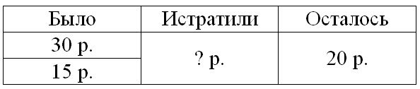 2) У Миши было 30 р., а у Коли – 15 р. После того, как мальчики сходили в магазин, у них осталось 20 р. Сколько денег истратили мальчики?