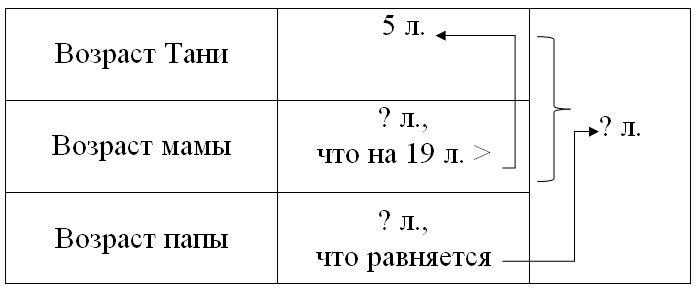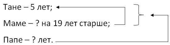Краткое условие: Тане 5 лет, мама на 19 лет старше Тани, а папе столько лет, сколько Тане и маме вместе. Задай вопрос и реши задачу.