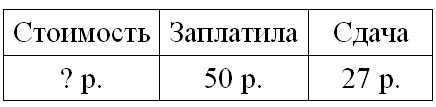 Краткое условие: Лена купила книгу. Сколько стоит эта книга, если Лена дала продавцу 50 р. и получила сдачи 27 р.? Для проверки составь две задачи, обратные данной, и реши их.