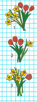 1. В букете у Кати 4 нарцисса и 3 тюльпана. Значит, её букет первый.