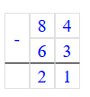 1) 84 – 63 = 21;