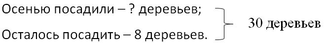 Краткое условие: Около школы решили посадить 30 деревьев. После осенних посадок осталось посадить ещё 8 деревьев. Сколько деревьев посадили осенью?