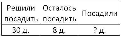 1) 30 – 8 = 22 д. – посадили