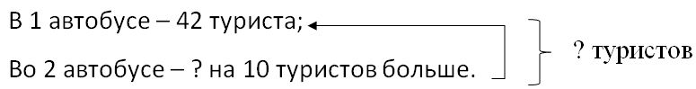 Краткое условие: На одном автобусе в Псков приехали 42 туриста, а на другом — на 10 туристов больше. Сколько всего туристов ... ?