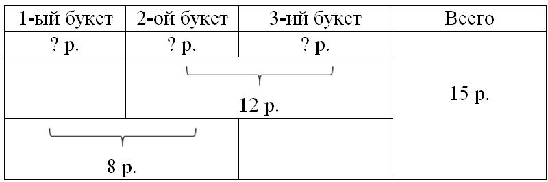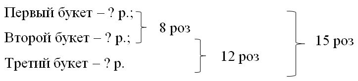 Краткое условие: В трёх букетах всего 15 роз. В первом и во втором вместе 8 роз, а во втором и в третьем вместе 12: роз. Сколько роз в каждом букете?