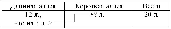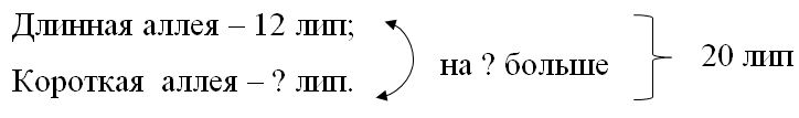 Краткое условие: На двух аллеях парка, длинной и короткой 20 лип. На длинной аллее 12 лип. На сколько лип больше на длинной аллее, чем на короткой?