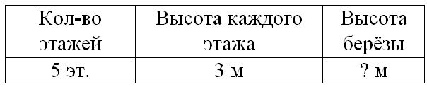 Краткое условие: В нашем доме 5 этажей. Высота каждого этажа 3 м. У дома растёт берёза, вершина которой достаёт до крыши дома. Узнай высоту берёзы.
