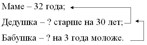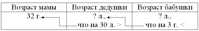 Краткое условие: Маме 32 года, дедушка старше мамы на 30 лет, а бабушка на 3 года моложе дедушки. Сколько лет бабушке?