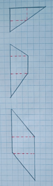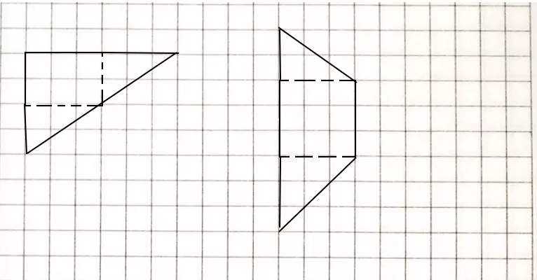 3) Проведем в каждой фигуре 2 отрезка так, чтобы, разрезав по ним фигуры, можно получить 1 прямоугольник и 2 треугольника: