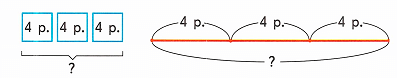 1) 3 • 4 = 3 + 3 + 3 + 3 = 6 + 6 = 12 р. – стоимость покупки