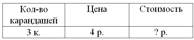 Краткое условие: Оля купила 3 карандаша, по 4 р. каждый. Сколько стоила эта покупка?