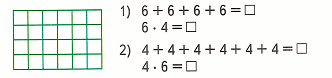 1. В первом случае клетки считали по строкам. В каждой строке по 6 одинаковых квадратов. Всего 4 такие строки. Чтобы узнать общее количество клеток, необходимо найти произведение чисел 6 и 4.