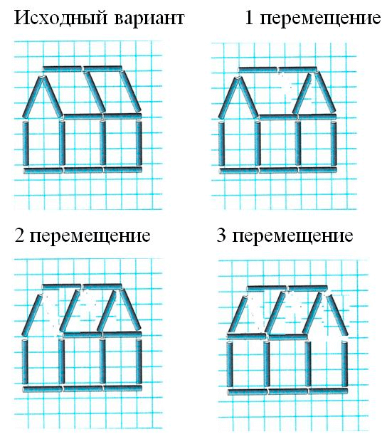Краткое условие: Переложи 3 палочки так, чтобы домик повернулся в другую сторону.