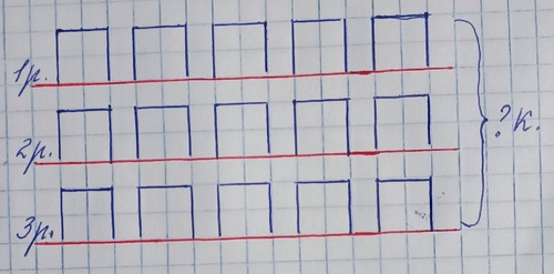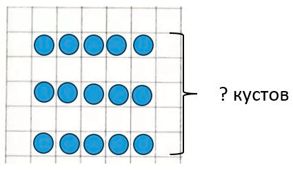 Краткое условие: В школьном саду 3 ряда кустов смородины, по 5 кустов в каждом ряду. Сколько всего кустов смородины в школьном саду? Сделай схематический рисунок и реши задачу.