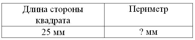 Краткое условие: Найди периметр квадрата со стороной 25 мм.