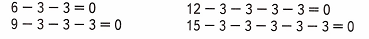 Так как 12 – 3 – 3 – 3 – 3 = 0, это значит, что в числе 12 содержится четыре раза по три.