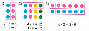 1. В первом случае кружочки считали по строкам. В каждой строке по 6 одинаковых кружков. Всего 2 такие строки. Чтобы узнать общее количество кружков, необходимо найти произведение чисел 6 и 2.