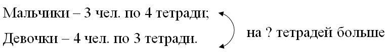 Краткое условие: Каждый из трёх мальчиков купил по 4 тетради, а каждая из четырёх девочек — по 3 тетради. Узнай, сколько тетрадей купили мальчики и сколько девочки. Что можно сказать о составленных выражениях? Об их значениях?