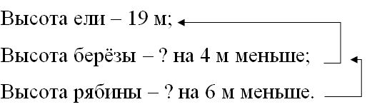 Краткое условие: 1) Высота ели 19 м, берёзы на 4 м меньше, чем ели, а высота рябины на 6 м меньше высоты берёзы. Объясни, что обозначают выражения: 2) Составь по выражениям похожие задачи и реши их.