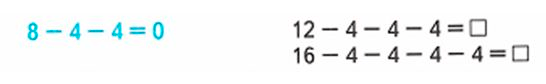 Так как 16 – 4 – 4 – 4 – 4 = 0, это значит, что в числе 16 содержится четыре раза по четыре.