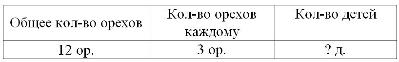 Краткое условие: Сделай к задаче рисунок и реши её. Детям раздали 12 орехов, по 3 ореха каждому. Сколько детей получили орехи?