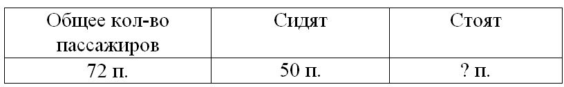 Краткое условие: В автобусе едут 72 пассажира. Из них 50 пассажиров сидят, а остальные стоят. Сколько пассажиров стоят? Составь и реши задачу, обратную данной.