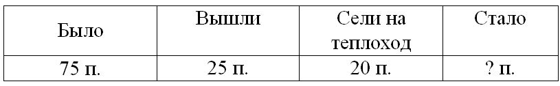 Краткое условие: На теплоходе было 75 пассажиров. На пристани 25 пассажиров вышли, а 20 сели на теплоход. Сколько пассажиров стало на теплоходе?