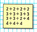 Лишним является третье выражение, так как во всех остальных выражениях записана сумма одинаковых слагаемых, а в третьем выражении слагаемые различны.