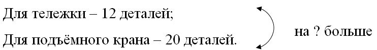 Чтобы сделать тележку, Никите потребовалось 12 деталей конструктора, а для подъёмного крана – 20 деталей. На сколько больше деталей понадобилось Никите для подъёмного крана, чем для конструктора?