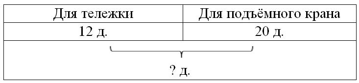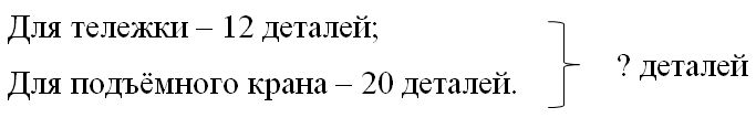 Краткое условие: Чтобы сделать тележку, Никите потребовалось 12 деталей конструктора, а для подъёмного крана — 20 деталей. Задай вопрос и реши задачу. Задай другой вопрос к тому же условию и реши новую задачу.