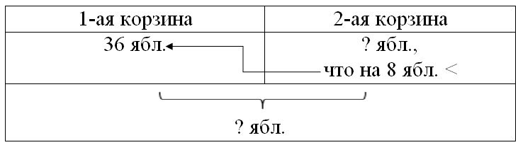 В первой корзине было 36 яблок, а во второй – на 8 яблок меньше, чем в первой. Сколько всего яблок в двух корзинах?
