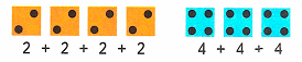 1. 2 + 2 + 2 + 2 = 4 + 4 = 8;