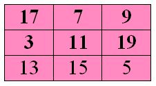 2) Оставляя на местах числа 13, 15 и 5, расставим в пустых клетках числа 3, 7, 9, 11, 17, 19 так, чтобы получился магический квадрат: