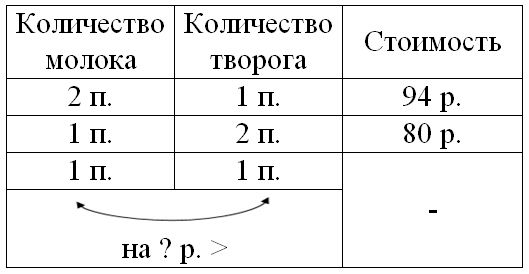 Краткое условие: Два одинаковых пакета молока и пачка творога стоят 94 р. Две такие же пачки творога и один такой же пакет молока стоят 80 р. На сколько рублей один пакет молока дороже одной пачки творога?