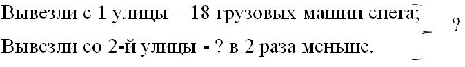 Краткое условие: С одной улицы вывезли 18 грузовых машин снега, а с другой — в 2 раза меньше. Сколько всего машин снега вывезли с двух улиц?