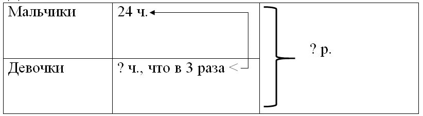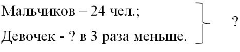 Краткое условие: Ребята расчищали от снега дорожки около школы. Мальчиков было 24, а девочек — в 3 раза меньше. Сколько всего ребят работало на расчистке дорожек от снега?