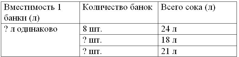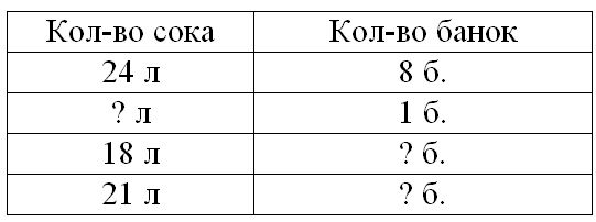 Краткое условие: 1) 24 л фруктового сока разлили в 8 банок поровну. Сколько надо таких банок, чтобы разлить 18 л сока? 21 л сока? 2) Составь задачу по выражению