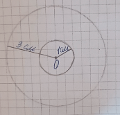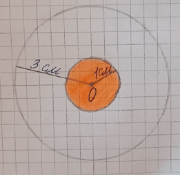 Краткое условие: Начерти две окружности с одним центром так, чтобы радиус первой был 3 см, а радиус второй составлял третью часть радиуса первой окружности. Закрась круг с меньшим радиусом.