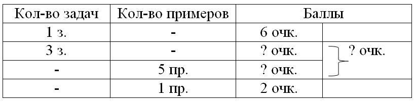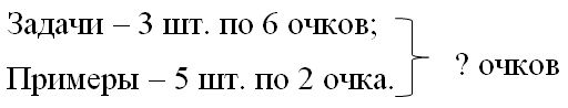 Краткое условие: На конкурсе «Смекалка» за решение каждой задачи давалось 6 очков, за решение примера — 2 очка. Миша решил 3 задачи и 5 примеров. Сколько очков он набрал?