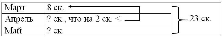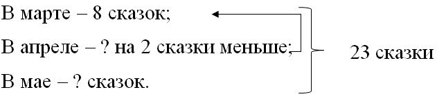 Краткое условие: В марте Нина прочитала 8 сказок, а в апреле — на 2 сказки меньше. Сколько сказок Нина прочитала в мае, если за эти три месяца она прочитала 23 сказки?