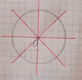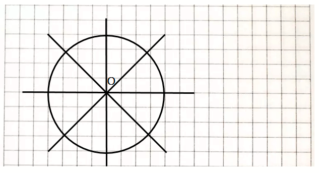 Краткое условие: Начерти в тетради окружность с центром в точке О радиусом 2 см. Проведи в окружности 4 оси симметрии.