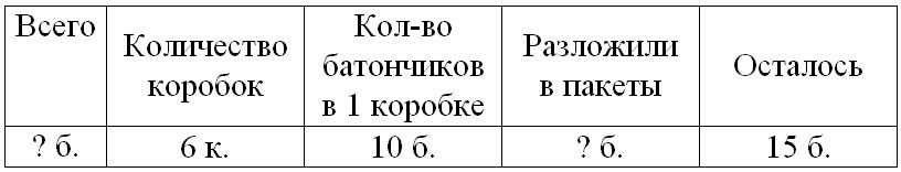 Краткое условие: Для новогодних подарков купили 6 коробок с шоколадными батончиками, по 10 батончиков в каждой. После того как несколько батончиков разложили в пакеты с подарками, осталось 15 батончиков. Сколько шоколадных батончиков уже разложили?