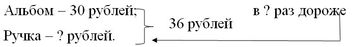 Краткое условие: За альбом и ручку заплатили 36 р. Альбом стоит 30 р. Во сколько раз альбом дороже, чем ручка?