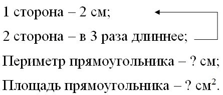 Краткое условие: Начерти прямоугольник, у которого длина одной стороны 2 см, а вторая сторона в 3 раза длиннее. Найди его периметр и площадь.