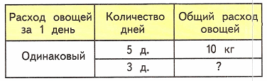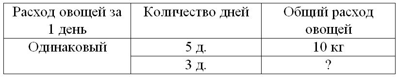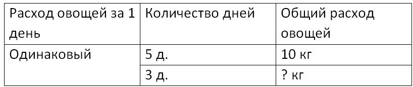 Краткое условие: За 5 дней в семье израсходовали 10 кг овощей. Сколько овощей израсходовали за 3 дня, если каждый день расходовали овощей поровну?