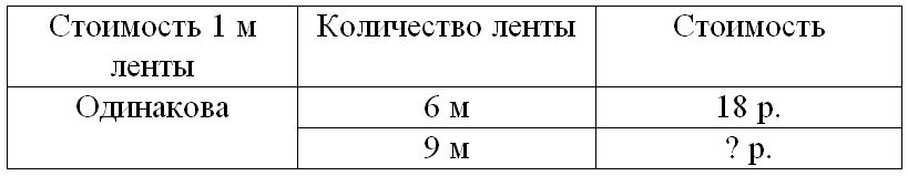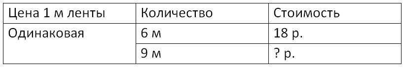 Краткое условие: За 6 м ленты заплатили 18 р. Сколько рублей стоит 9 м такой ленты?