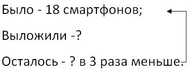Краткое условие: В коробке было 18 смартфонов. Сколько смартфонов выложили, если в коробке их осталось в 3 раза меньше, чем было сначала?