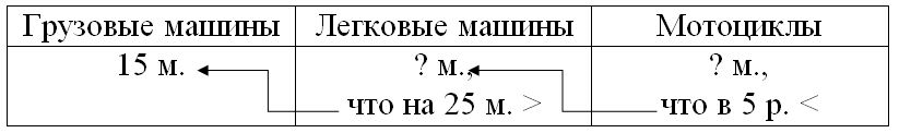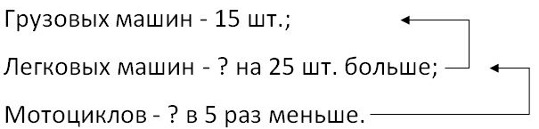 Краткое условие: На стоянке было 15 грузовых машин, легковых на 25 машин больше, чем грузовых, а мотоциклов в 5 раз меньше, чем легковых машин. Сколько мотоциклов было на стоянке?